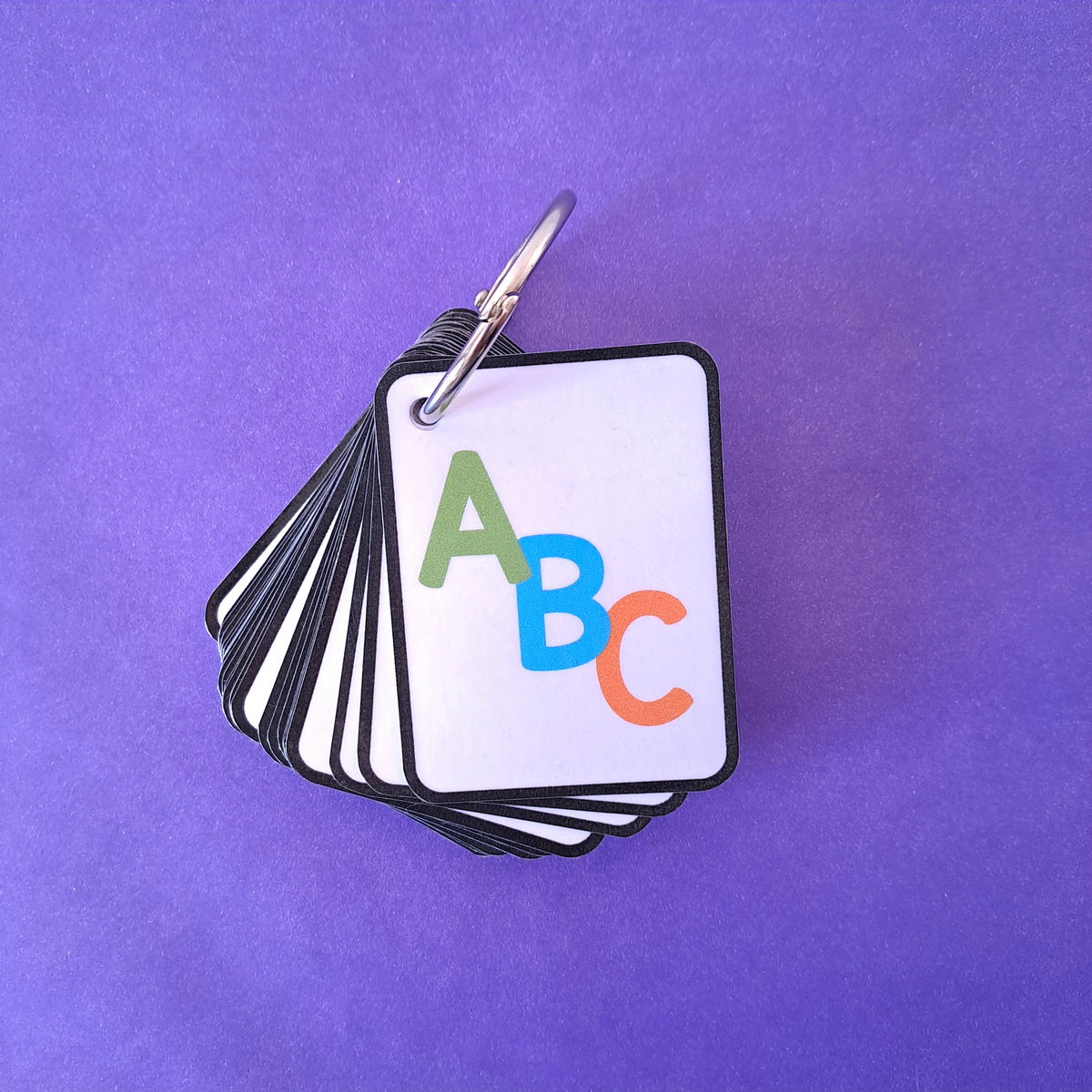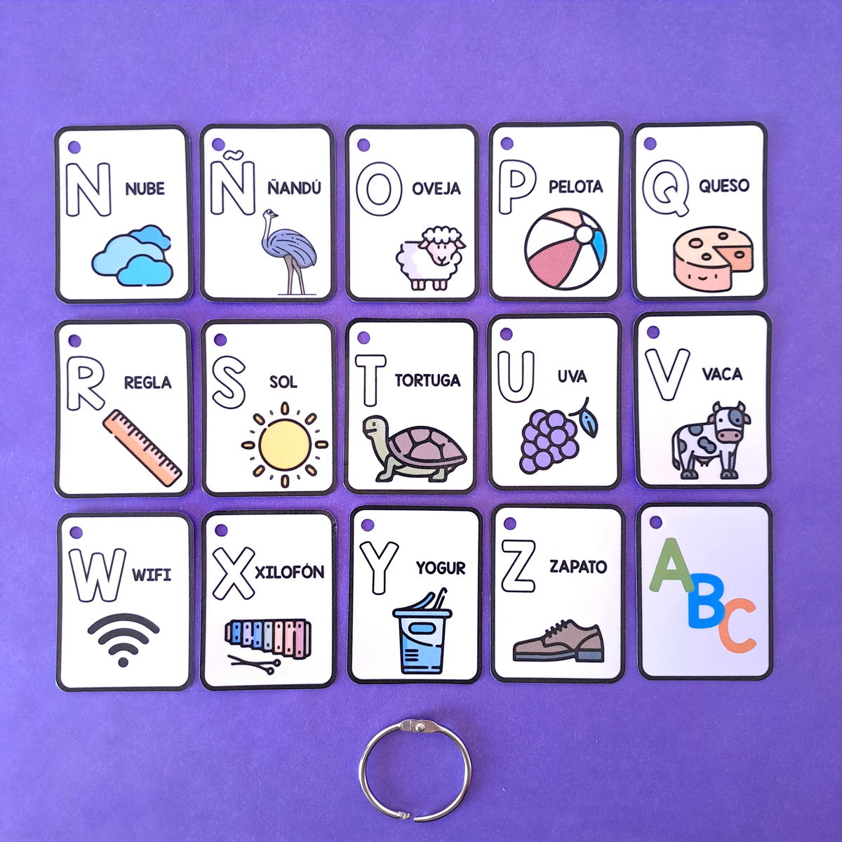 (cada ficha trae la letra en imprenta mayúscula, y un dibujo a modo de ejemplo)